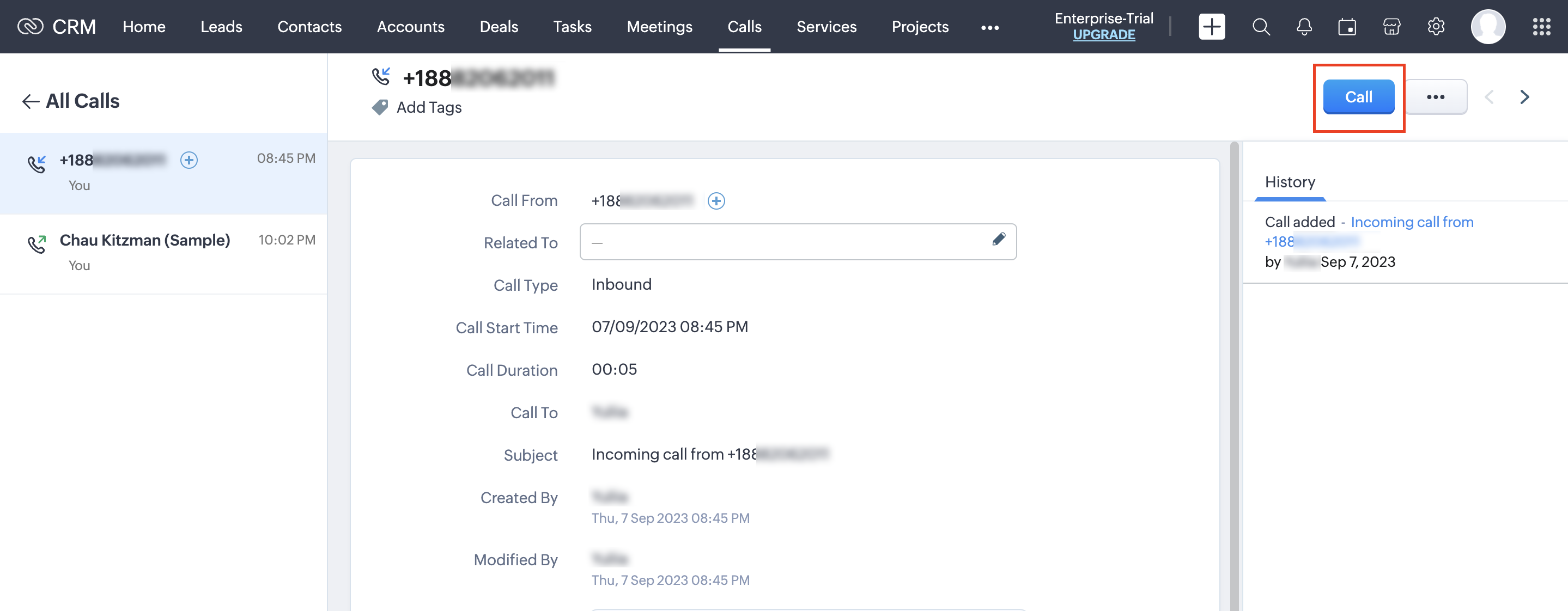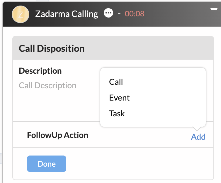 1. Call. If your client has requested a callback at a later time, in the pop-up notification window, press “Call”, enter a call subject, and call date and time, and then press “Done”. At the set time, Zoho CRM will notify you with an alert that it is time to make the call.