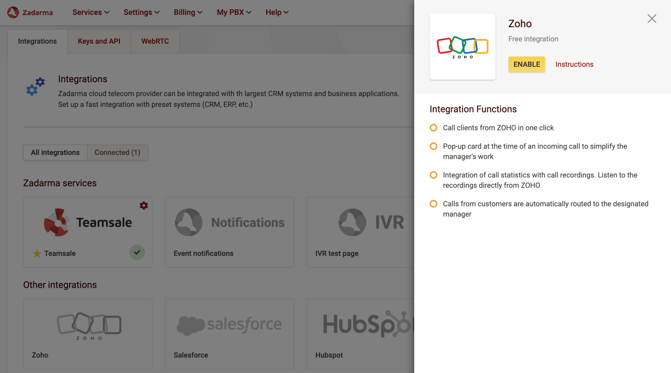 2. In your Zadarma Personal account, go to “Settings” - “API and integrations”, choose Zoho CRM and select “Enable”