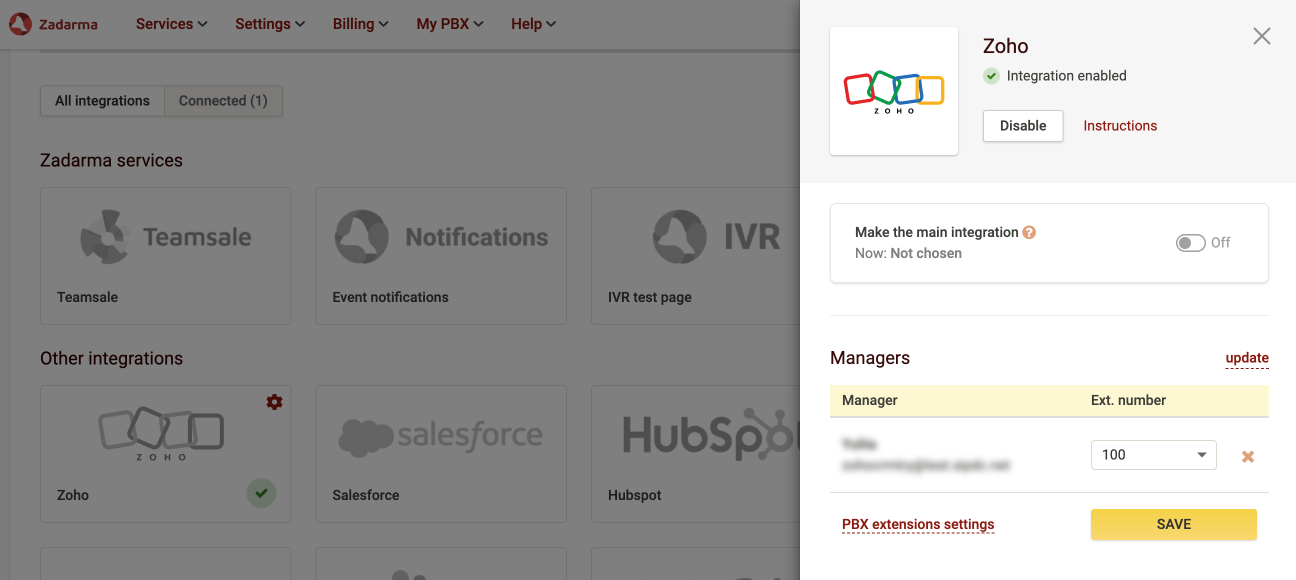 - Disable Zadarma PBX integration on the Settings - Integrations and API page