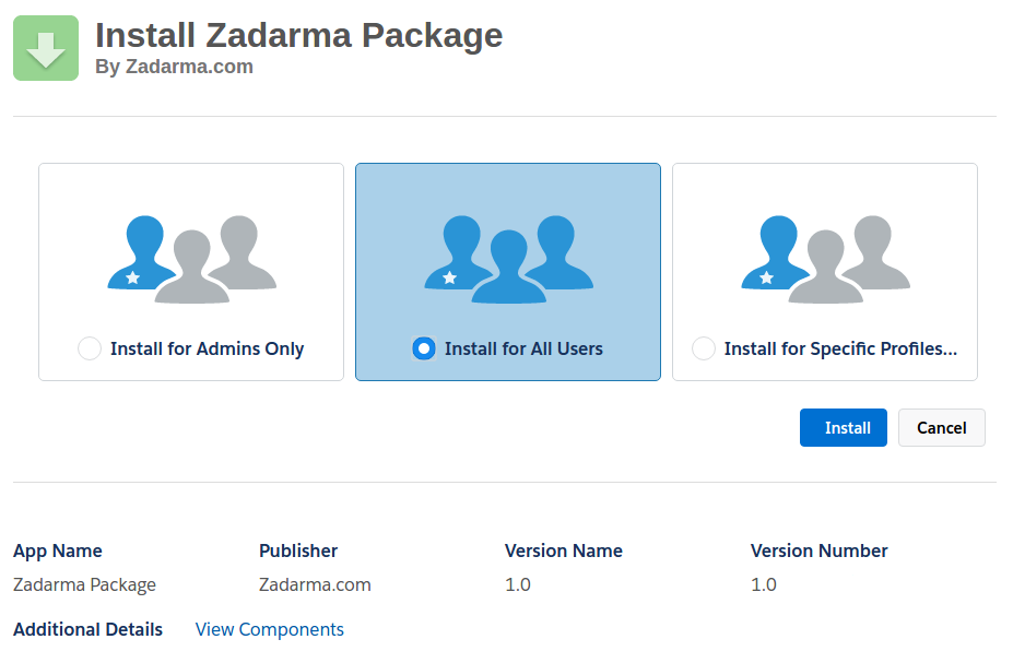 Select one of the options to install the integration application: for 1 user, for all users or for selected users and then click "Install".