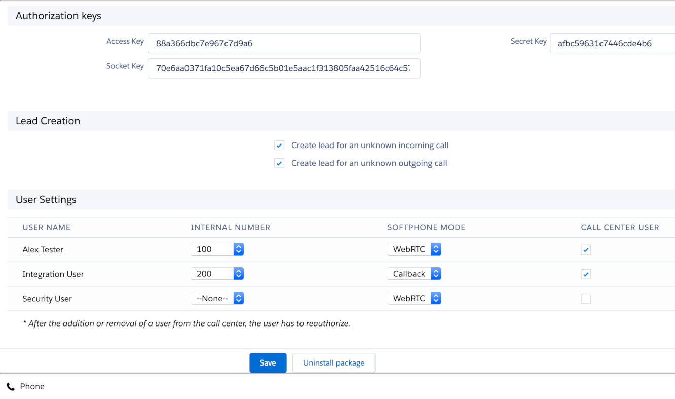 On the Zadarma Settings page, assign PBX extension numbers to Salesforce CRM users and choose WebRTC mode (calls straight from the browser) or Callback, in this case, an outgoing call back will be initiated to PBX extension number, which has to have a configured softphone or IP phone. You can also enable automatic lead creation for incoming calls from unknown numbers or outgoing calls to new numbers. Save the settings.