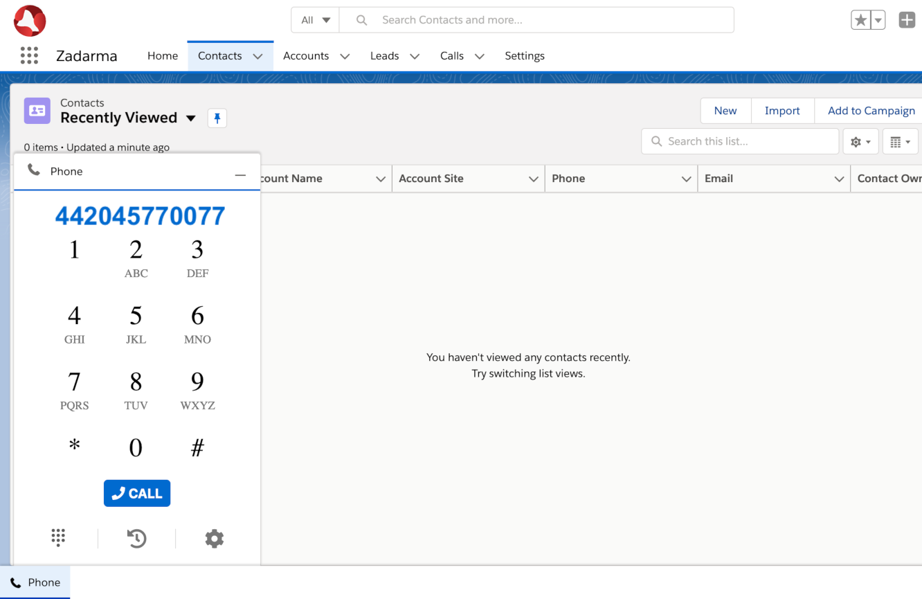 Virtual Zadarma PBX and Salesforce CRM is installed and configured.