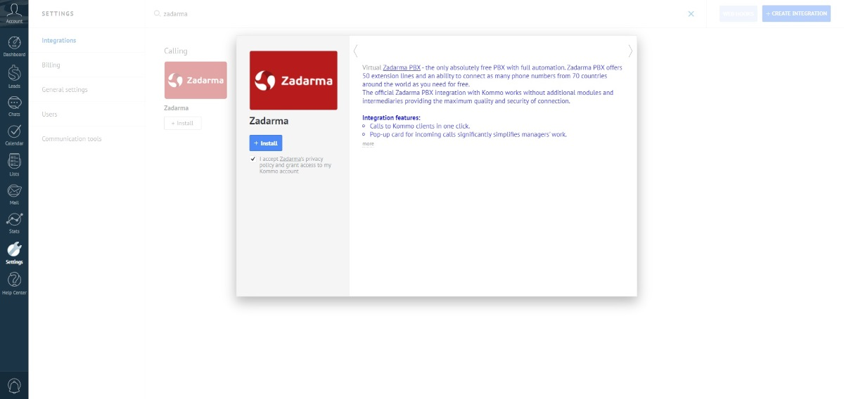 Zadarma-Kommo integration is completely free.