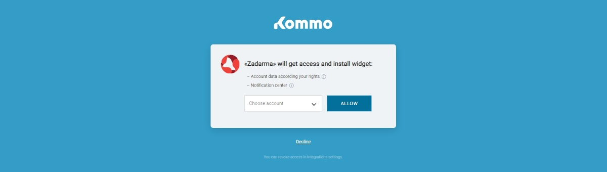 2. In your Zadarma personal account go to Settings - Integrations and API, then under All Integrations click on Kommo, then Enable. In the new window, choose your Kommo account and click Allow.