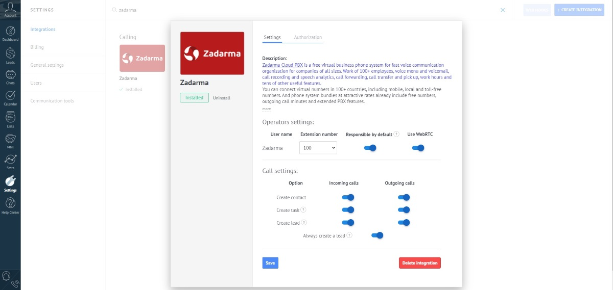 Below are the settings for calls, automatic creation of contacts, tasks, and deals.