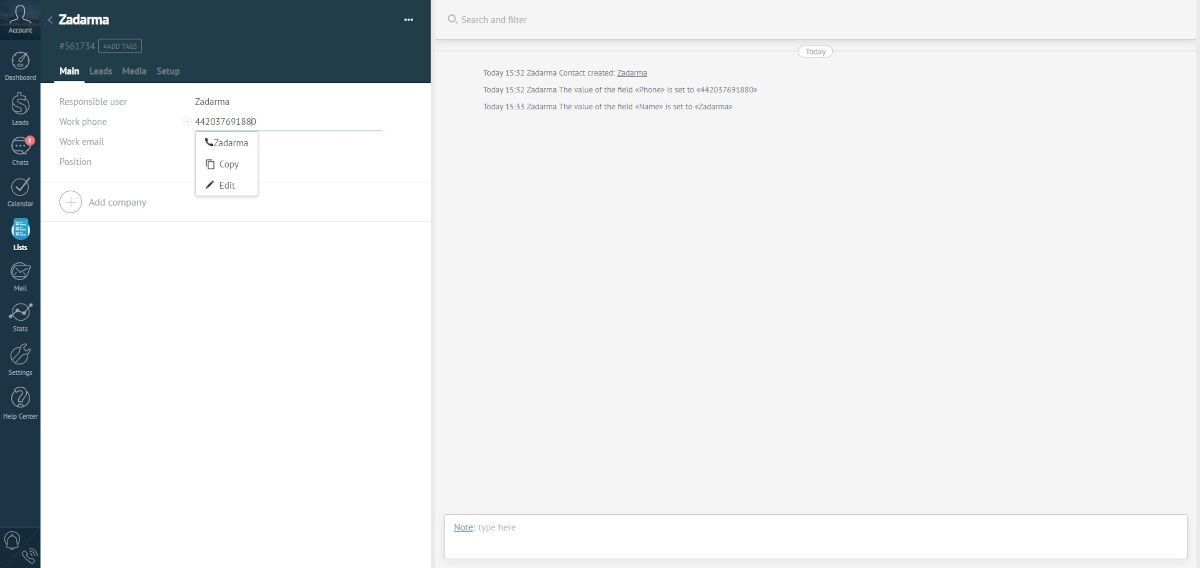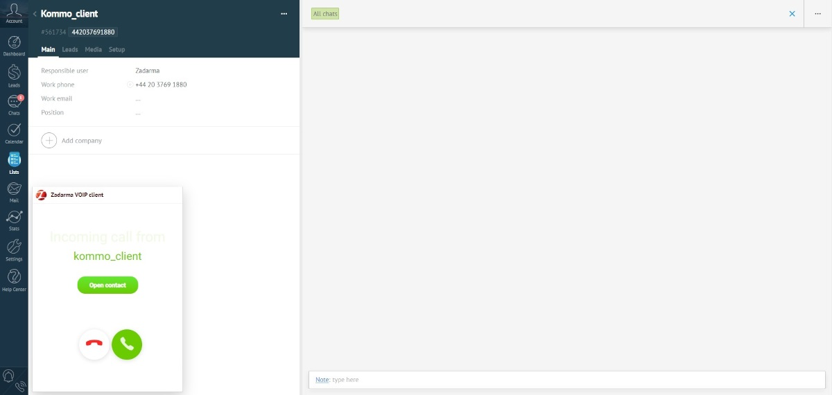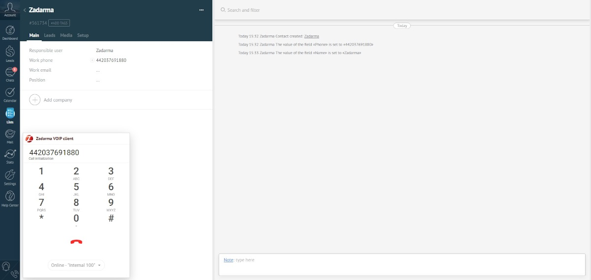 3. Zadarma PBX and Kommo integration is now set. To make an outgoing call, open a client's card, click on the phone number, then click on “Call”. If WebRTC mode is on, you can also dial a number using the webphone in the left bottom corner of the page. During the first call, you need to allow access to audio equipment in the pop-up window.