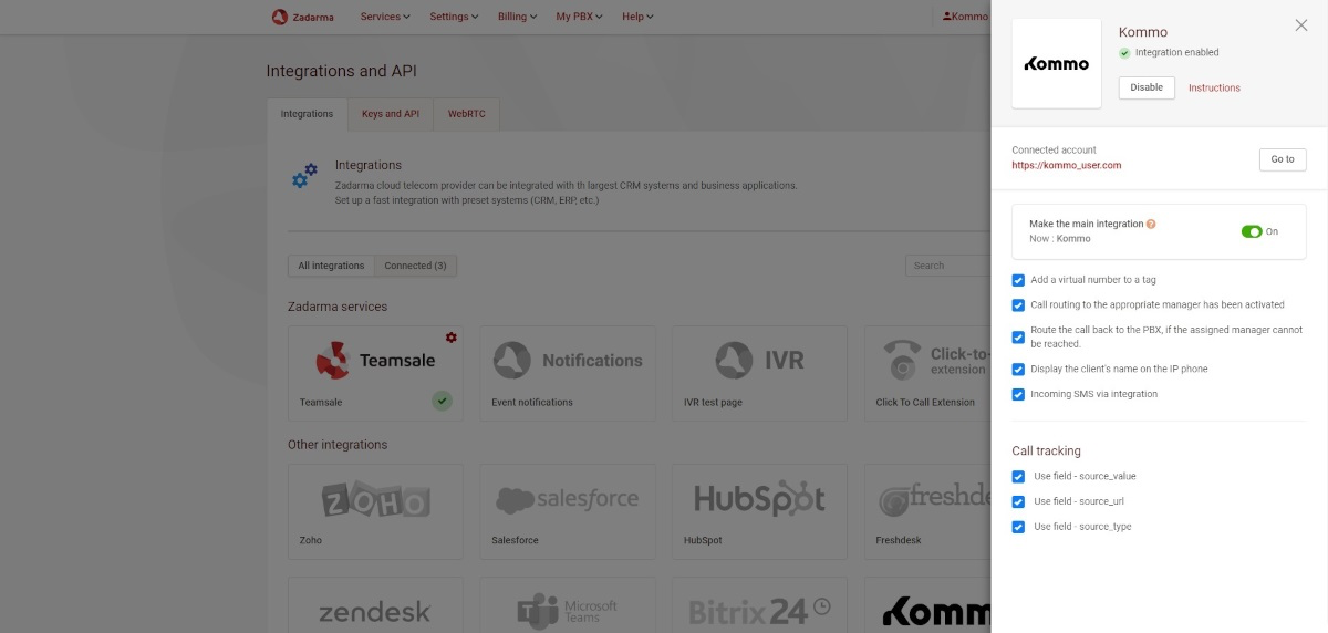 3. In your Zadarma personal account, in the “Settings - Integrations and API” section, by selecting “Kommo”, you can see which Kommo account has integration enabled and make it the main one, after which additional options for managing incoming calls will become available: