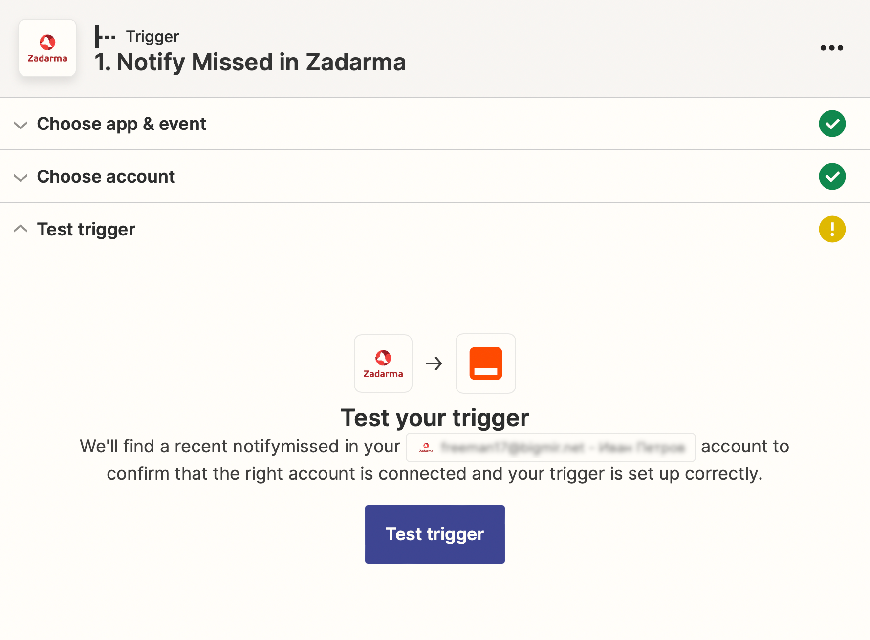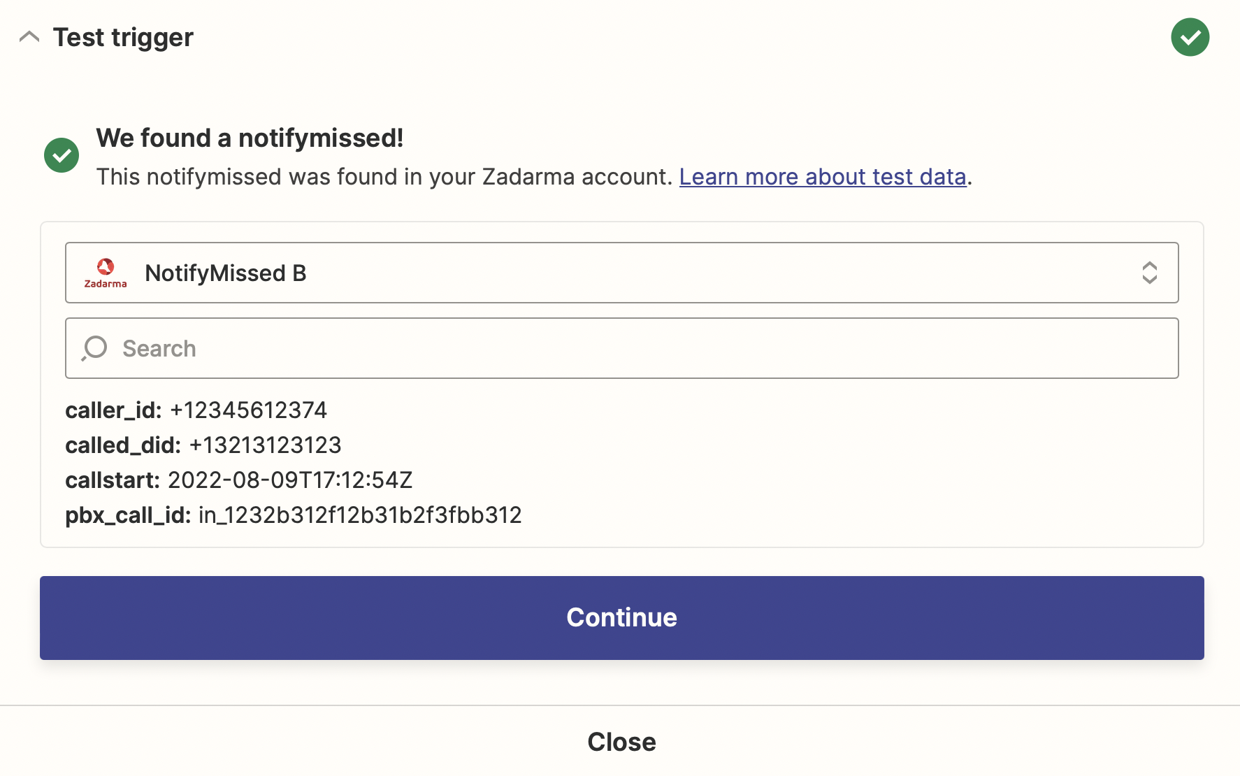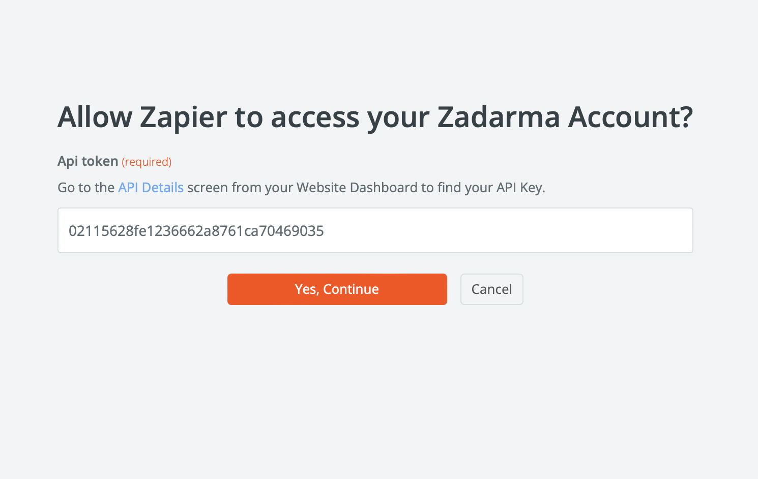 In the Zapier window that asks "Allow Zapier to access your Zadarma Account?", paste the token and click Yes, Continue to Zadarma and then click Continue in the trigger setup window.