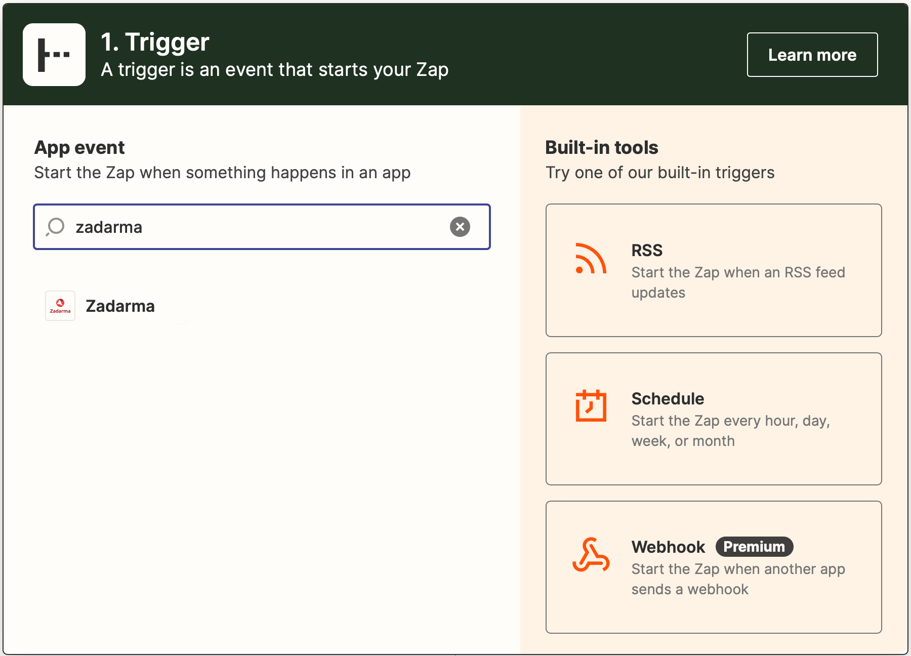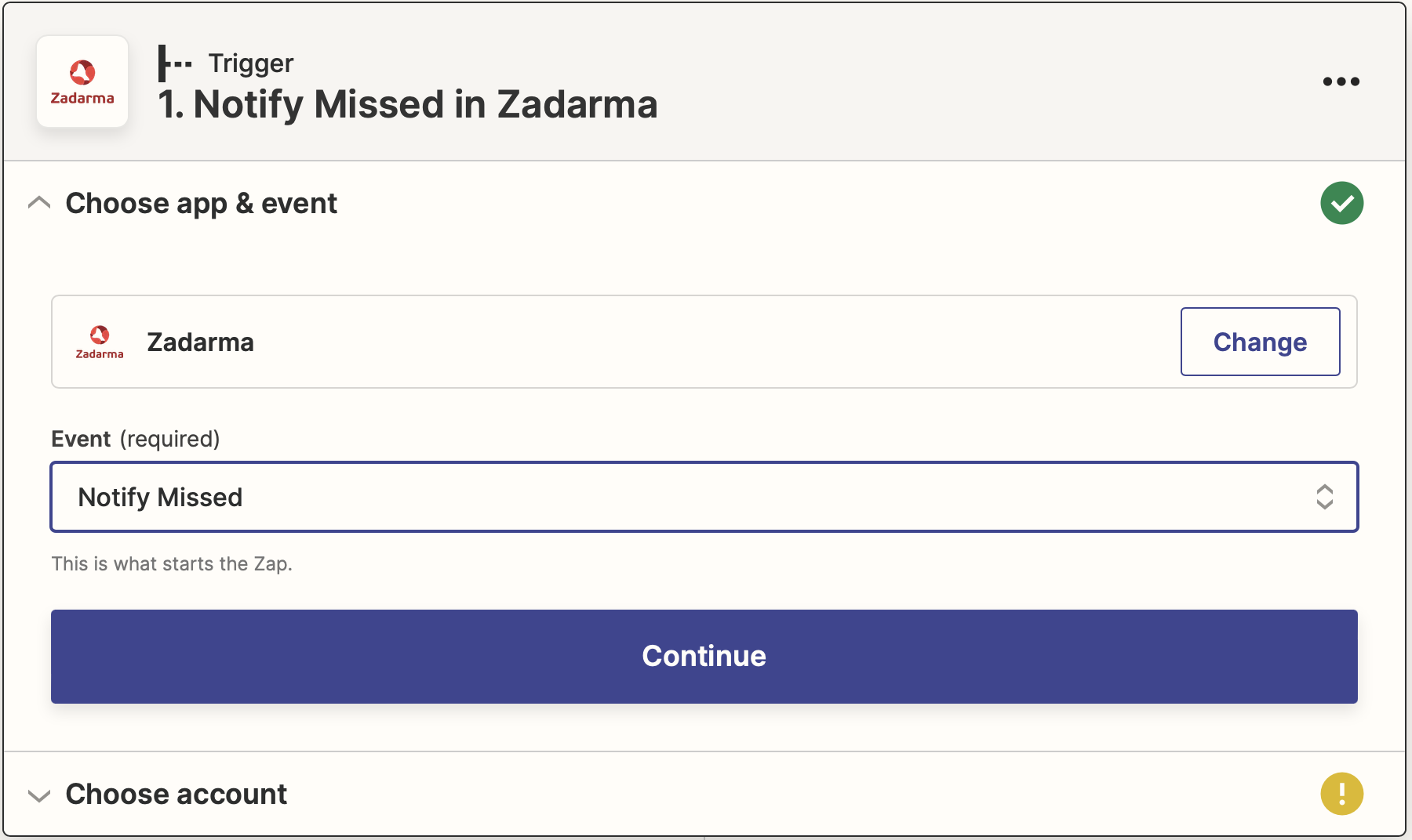 1. Log in to your Zapier account and select Create Zaps. In the Trigger section, find and select the Zadarma application.