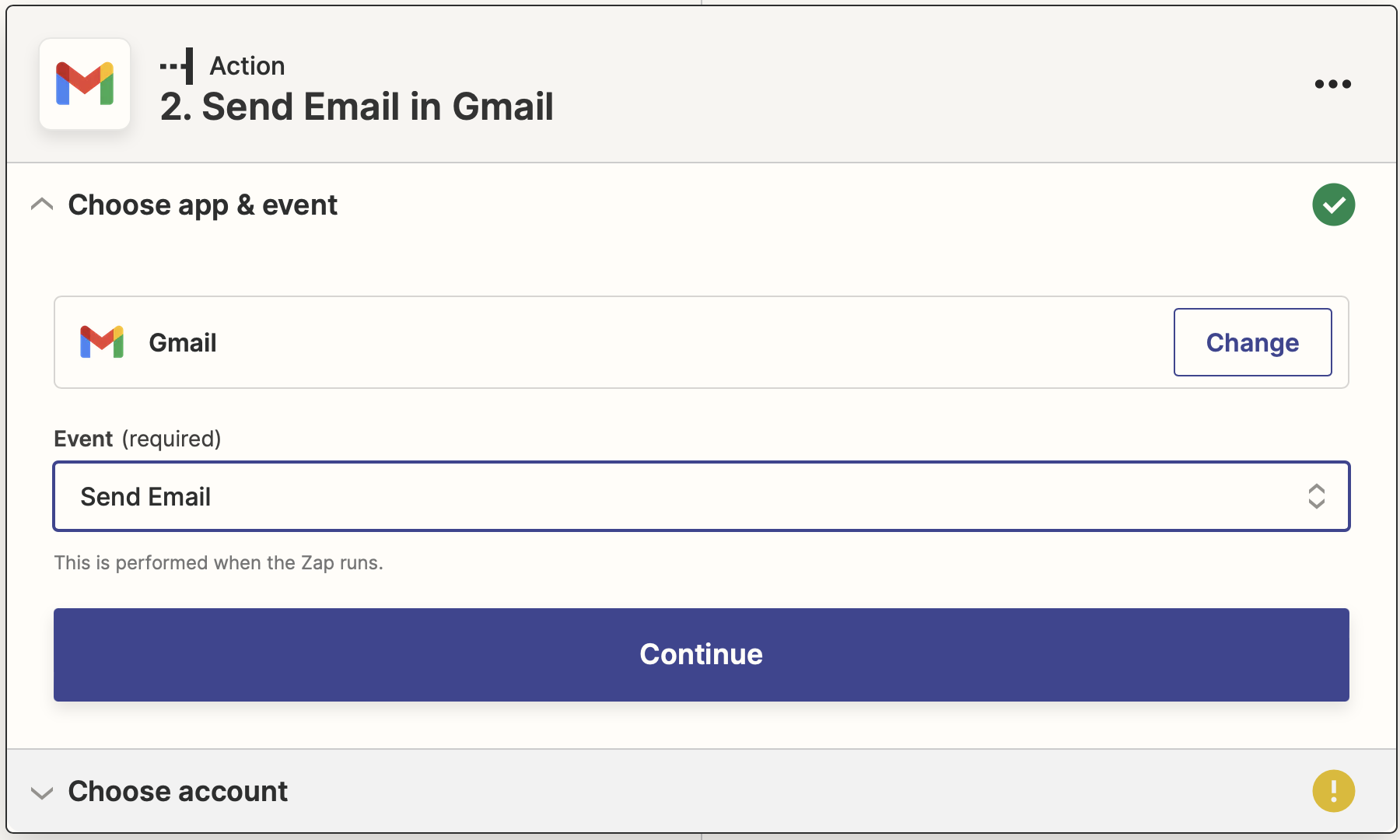 In the Account tab, click Continue. In the Actions tab, select the following values: