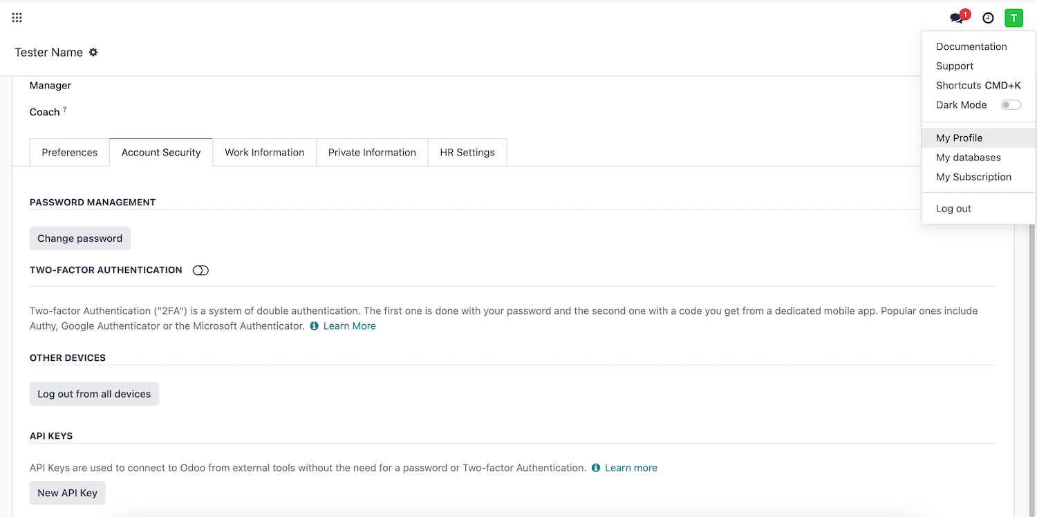 - In Odoo, go to My Profile - Account Security and click New API Key to create a key. In the pop-up window, enter the password for your Odoo account, then a description of the key (for example, Zadarma) and click Generate Key. Copy the received key and click Done.