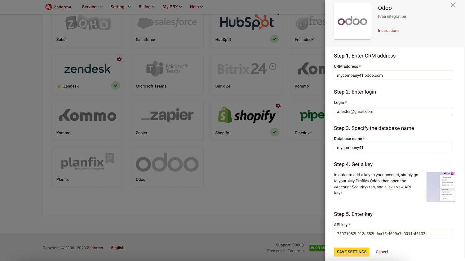 - In your Zadarma personal account, go to the “Settings - Integrations and API” section, select Odoo and enter the following data in the window on the right: