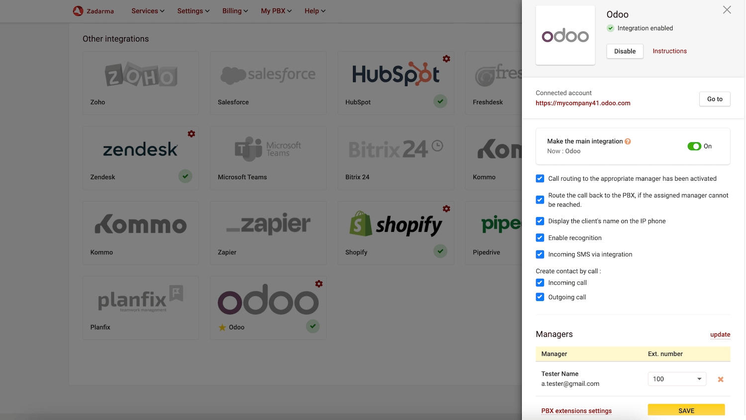 The following conditions must be met for Zadarma PBX and Odoo integration: