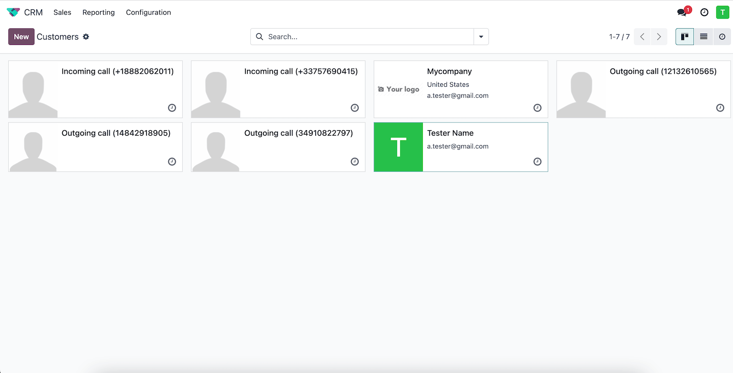 In Odoo CRM, in the Sales - Customers section, customers will be created after incoming or outgoing calls.