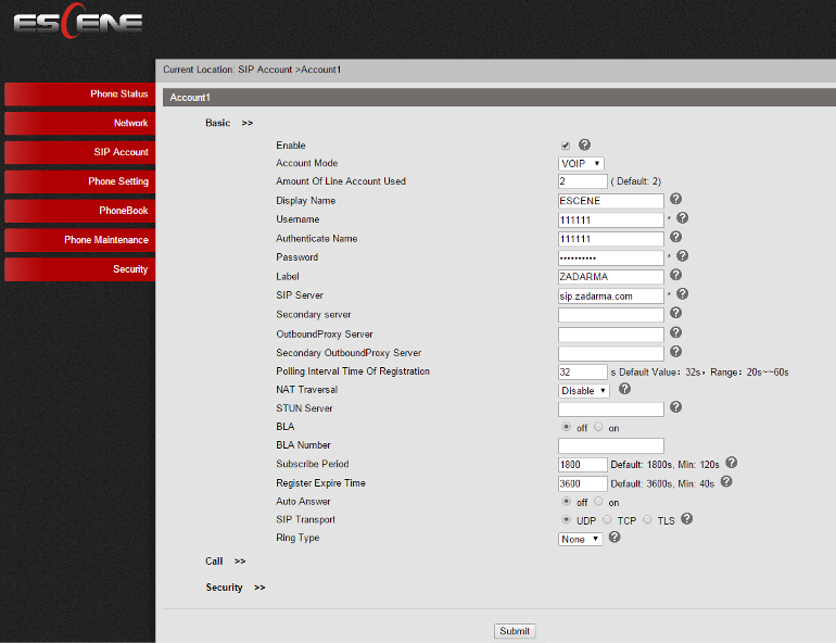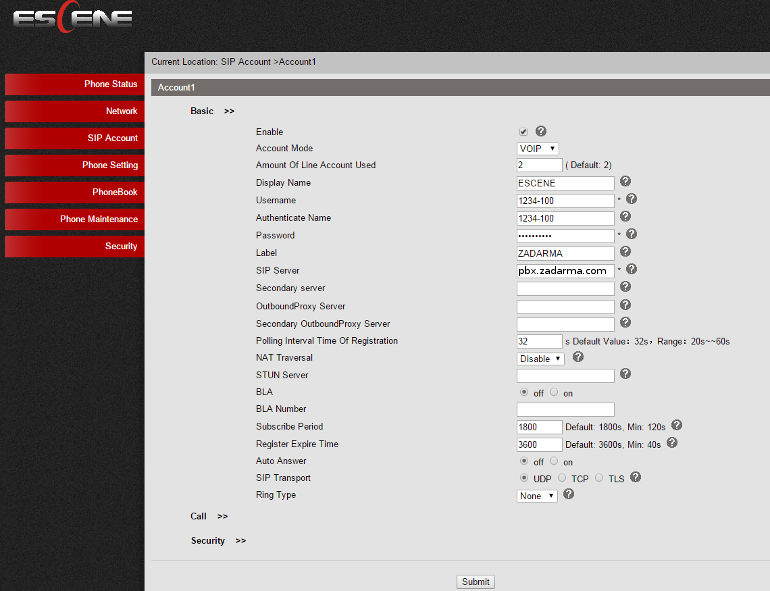 Name: Your internal PBX number (for example 1234-100) from personal account