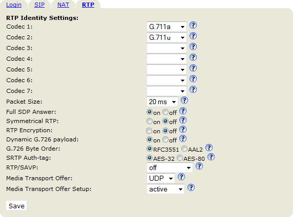 3. Open "RTP" and set codecs. For example G711a and G711u