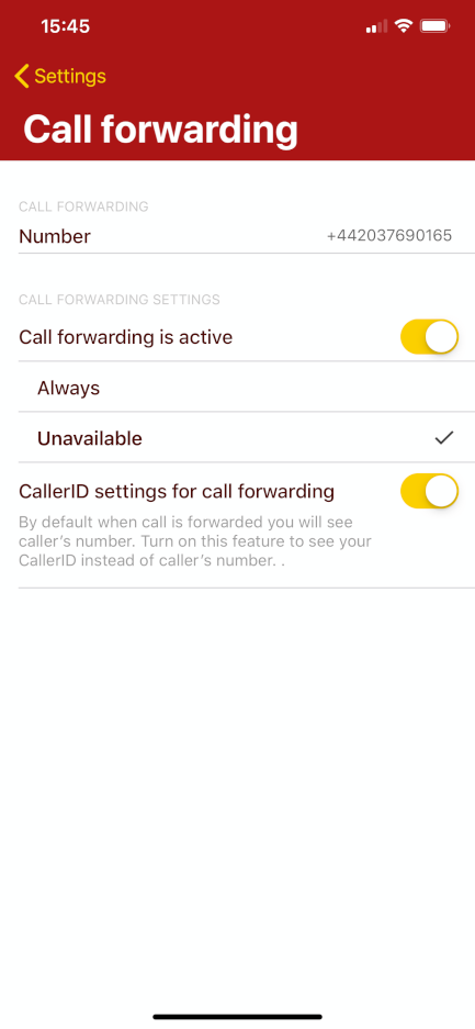 - Unavailable – conditional forwarding – if the internet connection is stable the call comes through the app, but if the internet is not sufficient it will be forwarded to the chosen number.