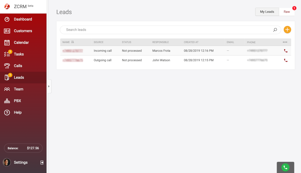 Clicking a plus icon next to the search bar will let you add a new lead. The difference is that a lead created from My leads page will be automatically assigned to you, and the one from the raw tab will remain without a responsible employee.