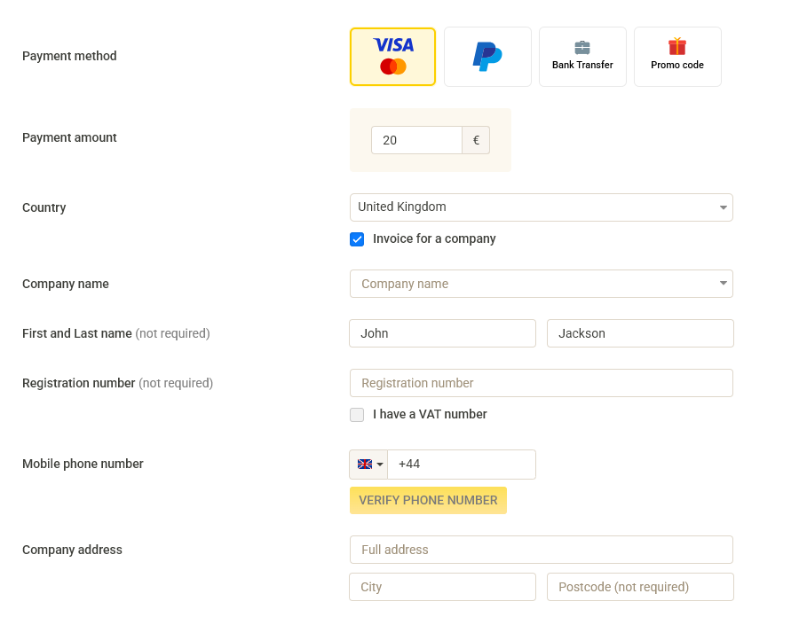 To receive an invoice when making a payment in your personal account via Visa, MasterCard or PayPal, you need to first check the “I want an invoice” box and fill in your company data that will appear on the invoice. After entering VAT number, click "Verify" to enable correct VAT calculation.