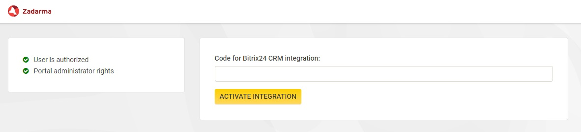 2. Select Bitrix24 tab and click “Enable integration”. An email with Bitrix24 integration code will be sent to your email address. You need to copy the integration code and enter it when installing Free Zadarma PBX.