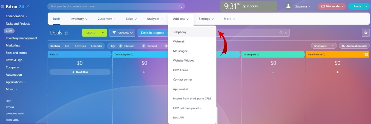 3. Log in to Bitrix24 as an Administrator. In the lower left corner go to Applications - All applications, and enter "Zadarma" in the application search window. Click on the Zadarma app.