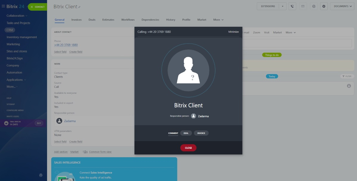 8. Integration of the Zadarma cloud PBX with Bitrix24 is configured. To make an outgoing call, select the desired Contact and click on the phone number.