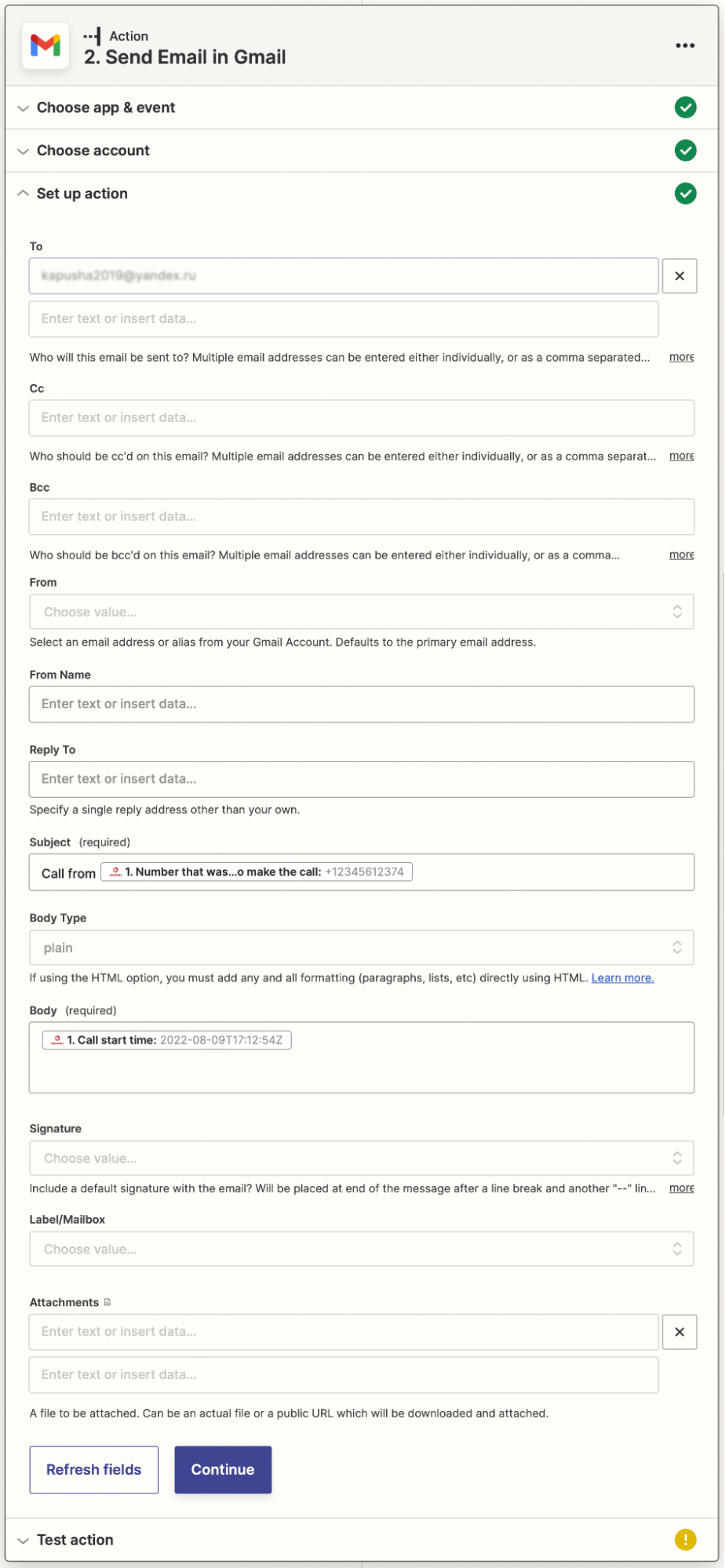 Setup is complete. A missed incoming call in the virtual PBX will trigger an action to send an email to the specified address. You can also configure any other action in Gmail or one of the other 5,000 available applications, such as Google Calendar, Microsoft Teams, Slack, Facebook Messenger, Twitter, Discord, and more. A complete list of applications is available here: https://zapier.com/apps
