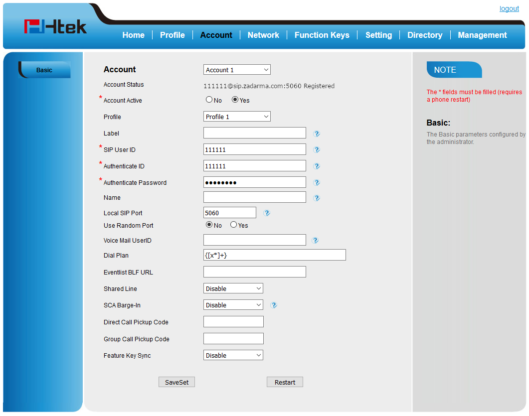 2. In phone’s web interface, go to the section "Account" - "Basic".